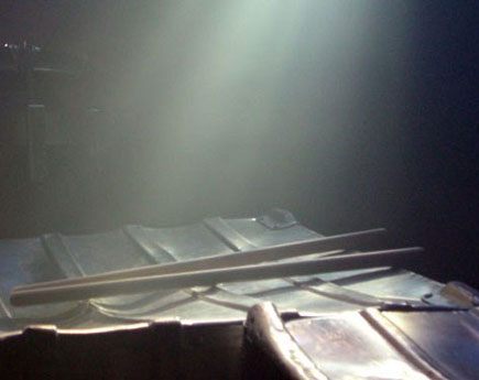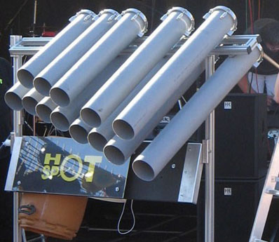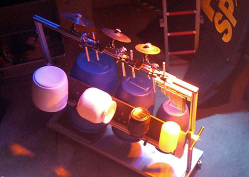 Equipment. Die grauen Plastikröhren waren ursprünglich Wasserrohre, die in genauem Verhältnis zueinander abgesängt, mit 6" Fellen bespannt und nach chromatischer Tonleiter gestimmt wurden - ein geiler Sound!