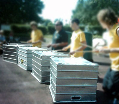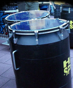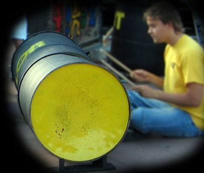 Unsere drei schwarzen Bassfässer bestehen aus aufgeschnittenen Plastiktonnen, denen jeweils ein 24" Bassdrumfell aufgezogen wurde! Zwei von ihnen können zudem noch mit Riffelblechen verkleidet werden.